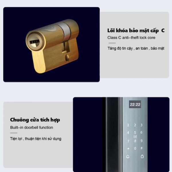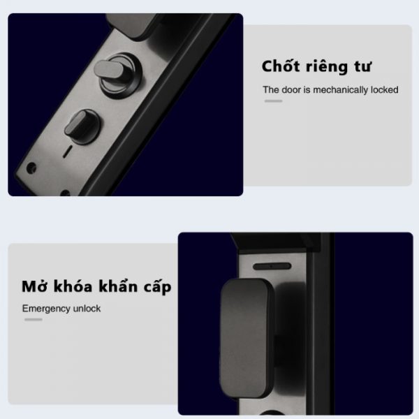 Bên cạnh đó những tính tính năng nhận dạng vân tay, nhận dạng thẻ từ hoặc smartphone được đằng ký, giúp xác định người dùng hợp lệ. Nếu có dấu hiệu không hợp lệ được đăng ký cố gắng mở khóa, tính năng cảnh báo đột nhập có thể được kích hoạt.