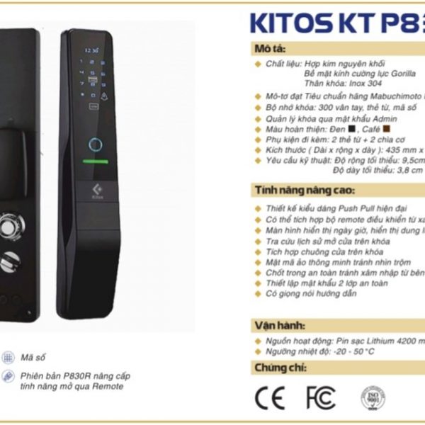 Khóa cửa vân tay Kitos KT-P830 là một trong những phiên bản bán chạy nhất Kitos, P830 được người tiêu dùng đón nhận và có những đánh giá tích cực.