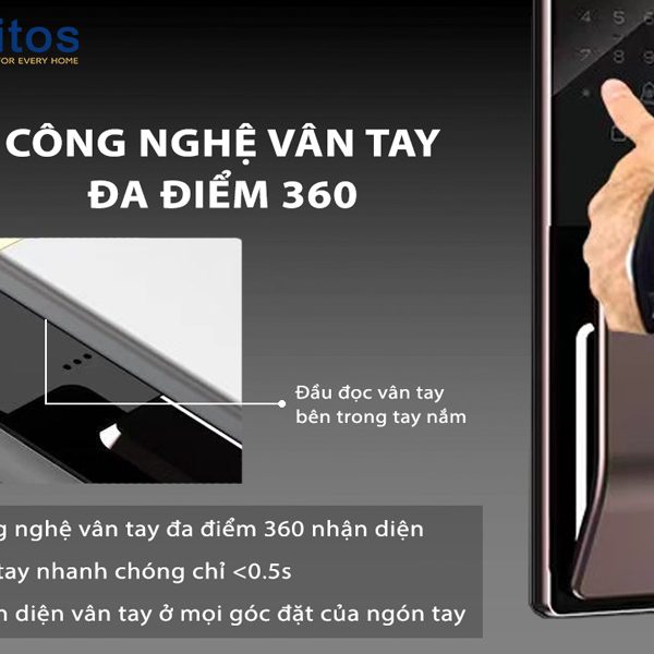 Khóa có công nghệ vân tay đa điểm 360 cho phép bạn mở khóa ở mọi góc cạnh đặt vân tay, ngay cả khi tay của bạn bị dính bụi bẩn, tay ướt hay vân tay mờ như người già và trẻ em.