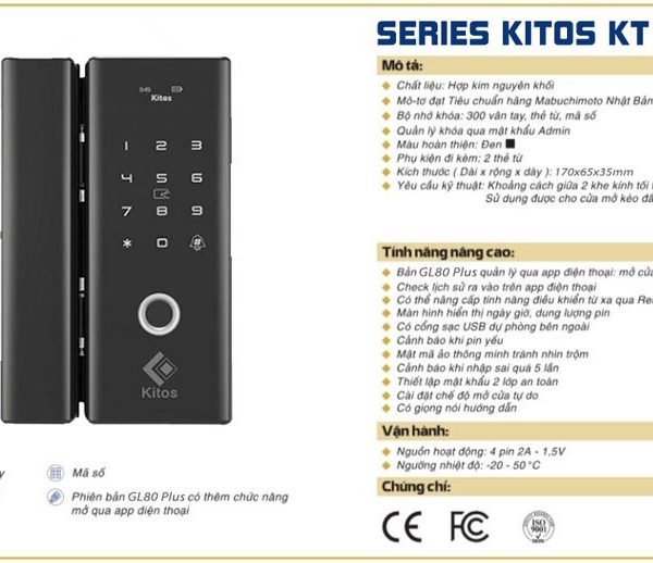 Kitos GL80 là dòng khóa vân tay cửa kính mới được ra mắt trên thị trường Việt Nam. Thiết kế tinh sảo, giá thành hợp lý, lắp đặt đơn giản không cần khoan đục như các dòng khóa cũ. GL80 đang dần có xu hướng chiếm lĩnh thị trường khóa vân tay cửa kính.